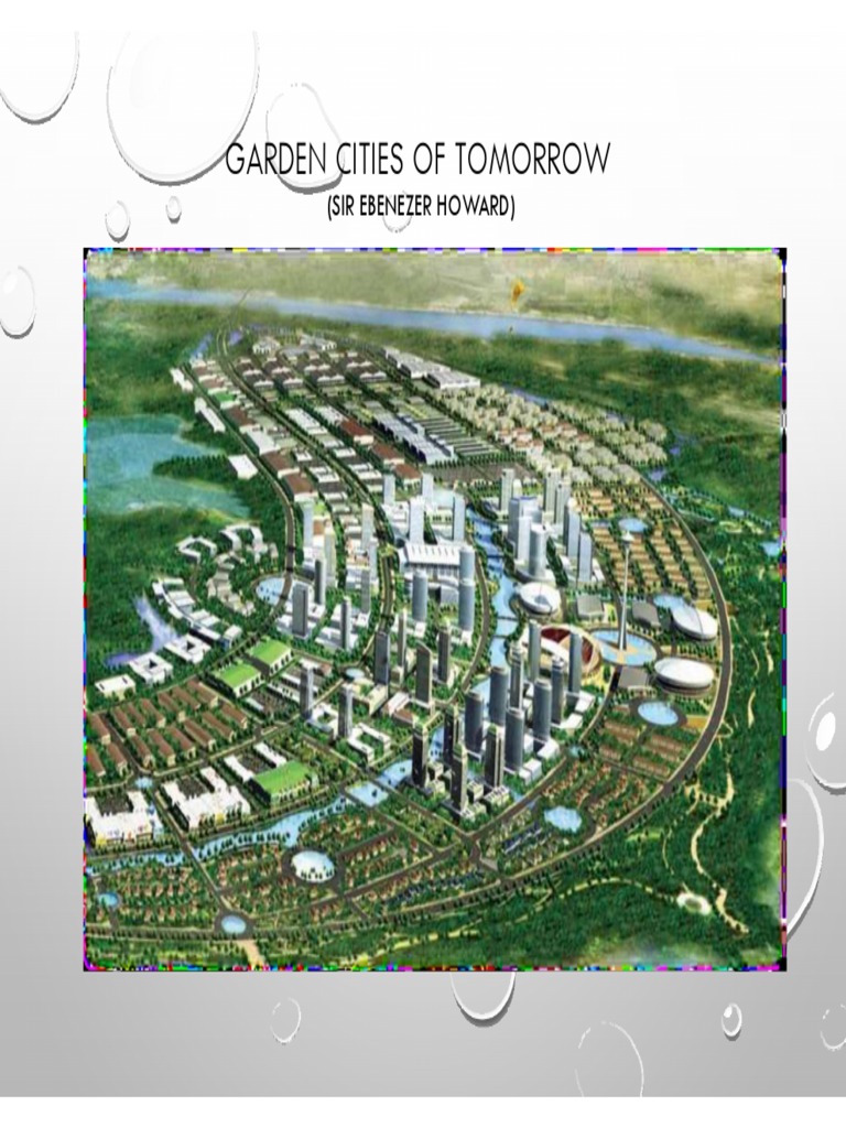 The legacy of Ebenezer Howard. It describes a utopian city in which people live harmoniously together with nature. The Garden City Movement was an idea of Sir Ebenezer Howard is known for his Publication Garden Cities of To-morrow 1898.